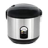 Cooking and eating healthy doesn't have to mean leaving the kitchen a mess and the sink full of dirty pots and pans. With this 700-watt countertop appliance, an entire meal for several people can be prepared quickly and easily. The rice cooker makes up to 18 cups of cooked rice at the push of a button. Simply add dry rice, measure in the water, and turn the unit on. Once the rice has finished cooking, the machine automatically switches over to a keep-warm function, which maintains a perfect serving temperature for up to 18 hours. The rice cooker's large-capacity removable steamer basket makes it possible to cook rice while simultaneously steaming seafood, poultry, vegetables, and more for a complete healthy meal. Other highlights include a hinged lid that seals and locks to control moisture and temperature during the keep-warm cycle, a dew collector that collects condensation and helps keep work surfaces dry, and a nonstick bowl that removes for easy cleaning. Accessories include a graduated measuring cup and a handy serving spatula. Attractively housed in durable stainless steel, the rice cooker measures 10-1/2 by 10-1/2 by 11-1/2 inches.